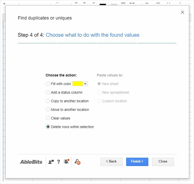 ๋ฐ๊ฒฌ๋ ์ค๋ณต ๊ฐ์ ์ด๋ป๊ฒ ์ฒ๋ฆฌํ ์ง ์ ํํฉ๋๋ค. ์ค๋ณต๊ฐ์ ์ ๊ฑฐํ๋ ค๋ฉด "Delete rows within selection"์ ์ ํํฉ๋๋ค. ์ด๋ ๊ฒ ์ ํํ๋ฉด ์ค๋ณต๋ ํ์ด ์ญ์ ๋ฉ๋๋ค.