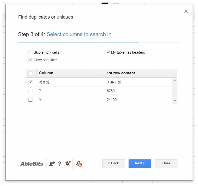 "ํ์ ํค๋๊ฐ ์๋์ง" ์ต์ ์์, ๋ฐ์ดํฐ์ ํค๋๊ฐ ์๋ ๊ฒฝ์ฐ "[My table has headers]"๋ฅผ ์ ํํ์ฌ ํค๋๋ฅผ ์ ์ธํ๊ณ ์ค๋ณต๊ฐ์ ์ฐพ์ต๋๋ค.