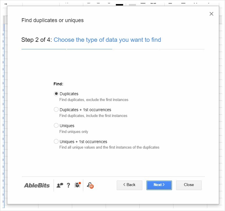 ๋ถ๊ฐ๊ธฐ๋ฅ ์ค์น ํ, ์คํ๋ ๋์ํธ์์ ์ค๋ณต๊ฐ์ ์ฐพ๊ณ ์ ํ๋ ๋ฐ์ดํฐ ํ์์ ์ ํํฉ๋๋ค. ์ค๋ณต๊ฐ์ ์ฐพ์ผ๋ ค๋ฉด "Duplicates"๋ฅผ ์ ํํฉ๋๋ค.
