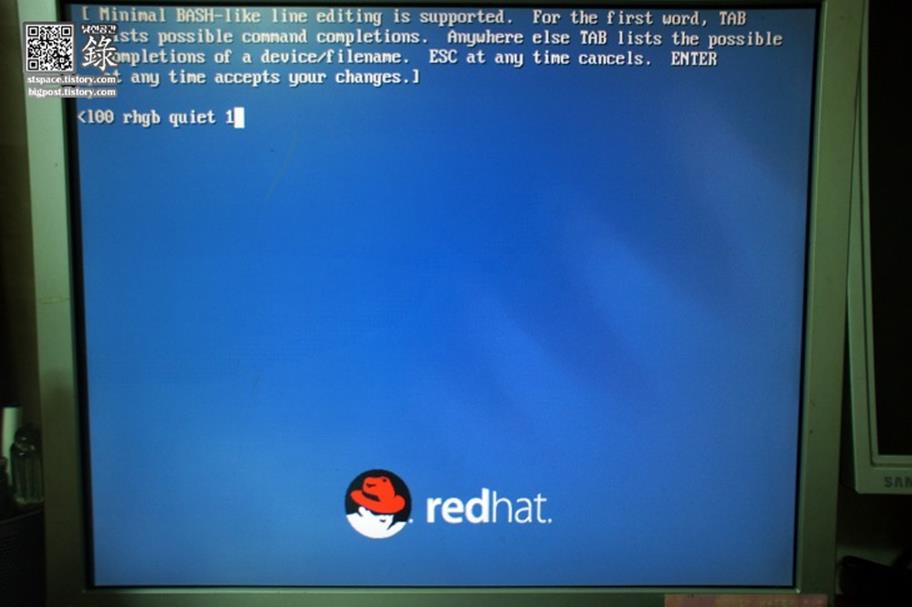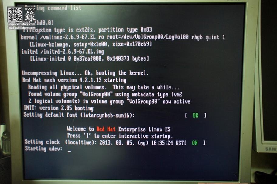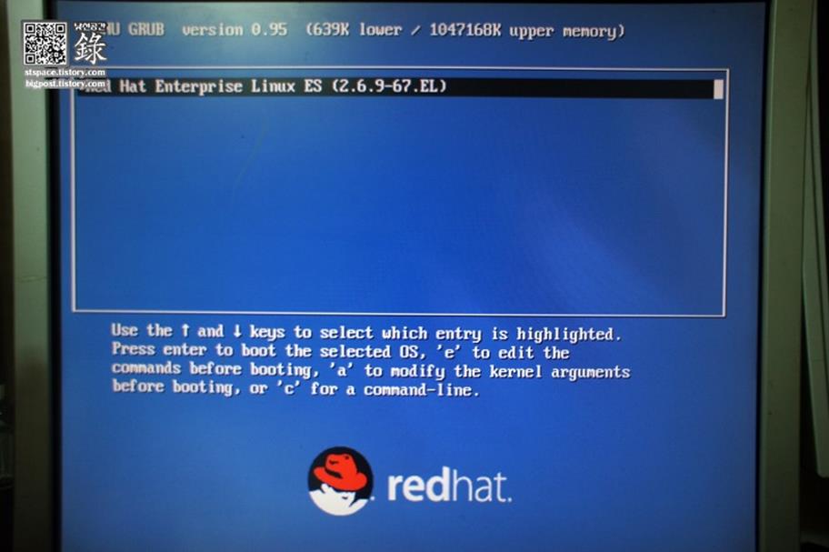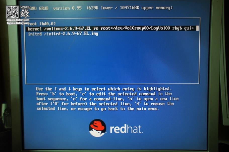 kernel /vmlinuz-2.6.9-67.EL ro root=/dev/VolGroup00/LogVol00 rhgp quiet๋ฅผ ์ ํํ๋ค.