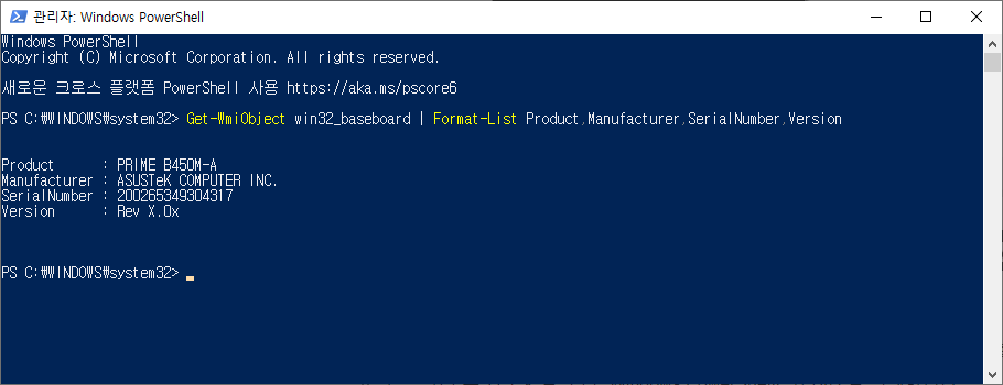ํ์์ ธ ์ฐฝ์ด ์ด๋ฆฌ๋ฉด ๋ค์ ๋ช ๋ น์ด๋ฅผ ์ ๋ ฅํ๊ณ ์ํฐ๋ฅผ ๋๋ฆ ๋๋ค:์ด ๋ช ๋ น์ด๋ ๋ฉ์ธ๋ณด๋์ ์ ์กฐ์ ์ฒด, ์ ํ๋ช , ์ผ๋ จ๋ฒํธ, ๋ฒ์ ์ ๋ณด๋ฅผ ๋ฆฌ์คํธ ํํ๋ก ํ์ํฉ๋๋ค. ์ด๋ฅผ ํตํด ๋ณด๋ค ๊ตฌ์ฒด์ ์ด๊ณ ์์ธํ ์ ๋ณด๋ฅผ ํ์ธํ ์ ์์ต๋๋ค. Get-WmiObject win32_baseboard | Format-List Product,Manufacturer,SerialNumber,Version