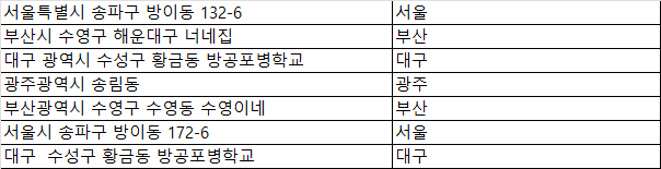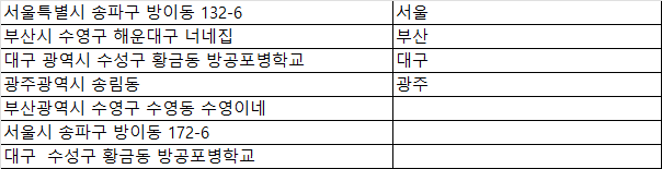 ์ ํ์์ ์ฒซ ๋ฒ์งธ ์ฃผ์ ์์ '์์ธ'์ ์ ๋ ฅํ๊ณ , Ctrl + E๋ฅผ ๋๋ฅด๋ฉด ์์ ์ด ๋๋จธ์ง ์ฃผ์์ ๋ํด ์๋์ผ๋ก '๋ถ์ฐ', '๋๊ตฌ'์ ๊ฐ์ ๊ด์ญ์ง๋ฐฉ๋จ์ฒด๋ฅผ ์ฑ์ ๋ฃ์ต๋๋ค.