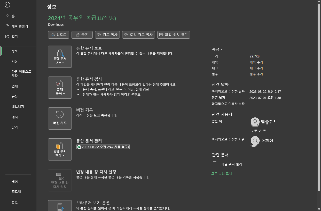 2. 정보 μ°ΎκΈ°: 파일 λ©”λ‰΄μ—μ„œ "정보"λ₯Ό μ„ νƒν•©λ‹ˆλ‹€.