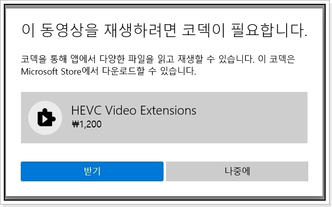 μλμ° 10, 11μμ μμ μ¬μ μ HEVC(κ³ κΈ λΉλμ€ μ½λ©) μ½λ±μ΄ νμν κ²½μ°κ° λ°μν μ μμ΅λλ€. νλ©΄μ΄ λμ€μ§ μκ³ μλ¦¬λ§ μ¬μλλ©°, "μ΄ λμμμ μ¬μνλ €λ©΄ hevc μ½λ±μ΄ νμν©λλ€."λΌλ λ©μμ§μ ν¨κ» λ§μ΄ν¬λ‘μννΈ μ€ν μ΄μμ 1,200μμ HEVC Video Extensions μ½λ±μ ꡬ맀νλΌλ μλ΄λ₯Ό λ°μ μ μμ΅λλ€. κ·Έλ¬λ λ€ννλ 무λ£λ‘ HEVC μ½λ±μ μ΅μ λ²μ μΌλ‘ λ€μ΄λ‘λνκ³ μ€μΉνλ λ°©λ²μ΄ μμ΅λλ€.
