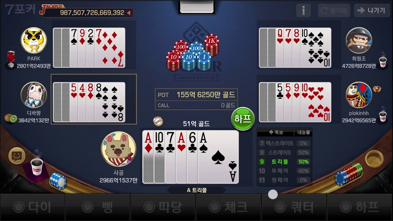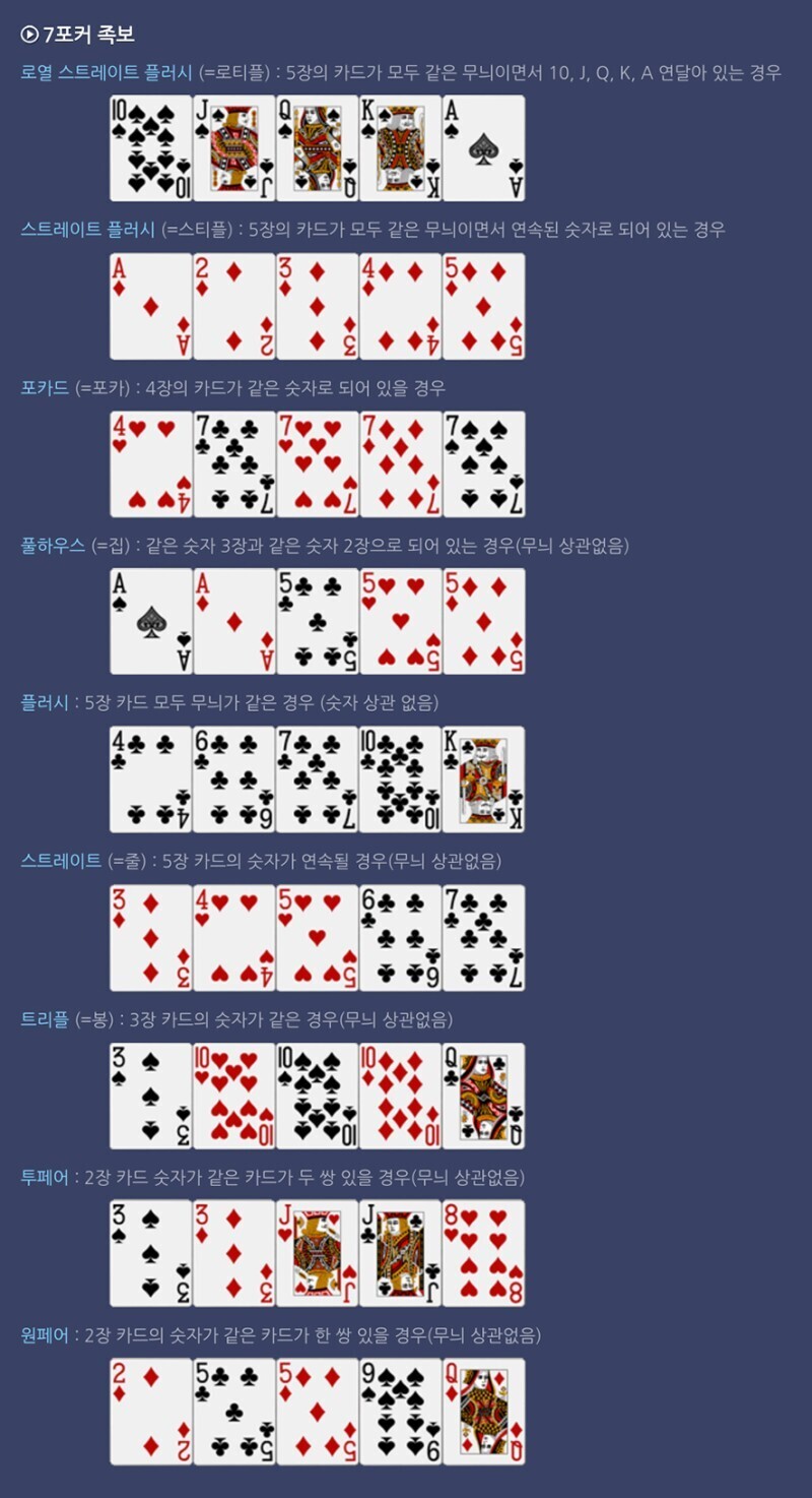 - 리λ²(River): λ§μ§λ§ μΉ΄λ 1μ₯μ΄ μΆκ°λ‘ 곡κ°λλ©°, μ΅μ’ 쑱보λ₯Ό μμ±ν©λλ€. κ°μ₯ λμ 쑱보λ₯Ό κ°μ§ νλ μ΄μ΄κ° μΉλ¦¬ν©λλ€.