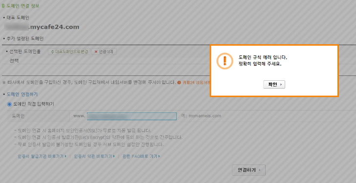 μΉ΄ν24 λλ©μΈμ 2μ°¨ λλ©μΈμΌλ‘ μ€μ νλ €κ³ ν κ²½μ°, λ±λ‘ μ μλμ κ°μ μ€λ₯ λ©μμ§λ₯Ό λ³΄κ² λ μ μμ΅λλ€. μ΄λ λ§€λμ§λ μλνλ μ€μμ μ§μ μ€μ ν μ μλ λΆλΆμ΄κΈ° λλ¬Έμ, κ³ κ°μΌν°λ₯Ό ν΅ν΄ μ§μμ μμ²ν΄μΌ ν©λλ€.