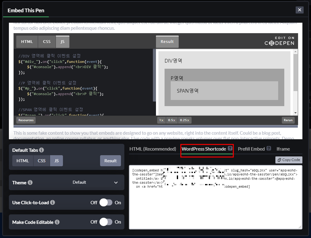 jsFiddle์ ์ฝ๋์ ์คํ ๊ฒฐ๊ณผ๋ฅผ ์ค์๊ฐ์ผ๋ก ํ์ธํ๊ณ ๊ณต์ ํ๋๋ฐ ๋งค์ฐ ์ ์ฉํ ๋๊ตฌ์ด์ง๋ง, ๊ฒ์์์ง ์ต์ ํ(SEO)์๋ ์ฝ๊ฐ์ ์ ํ์ด ์์ ์ ์์ต๋๋ค. ๊ทธ ์ด์ ๋ iframe์ ๋ค์ด ์๋ ์์ค ์ฝ๋ ๋ถ๋ถ์ด ๊ฒ์์์ง์ ์ํด ์์ง๋์ง ์์ ์ ์๊ธฐ ๋๋ฌธ์ ๋๋ค. ์ด ๋ฌธ์ ๋ฅผ ํด๊ฒฐํ๊ธฐ ์ํด ์ถ๊ฐ์ ์ผ๋ก ์ฝ๋๋ธ๋ก์ ์ด์ฉํด ์ค์ํ ์ฝ๋ ๋ถ๋ถ์ ๊ฐ์กฐํ๋ ๋ฐฉ๋ฒ์ ์ฌ์ฉํ ์ ์์ต๋๋ค.
