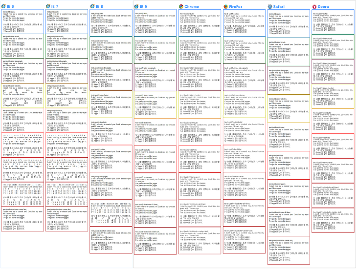 IE6,7์์๋ inter-cluster, kashida, newspaper, distribute-all-lines ๋ง ์ ์ฉ๋๋ค.