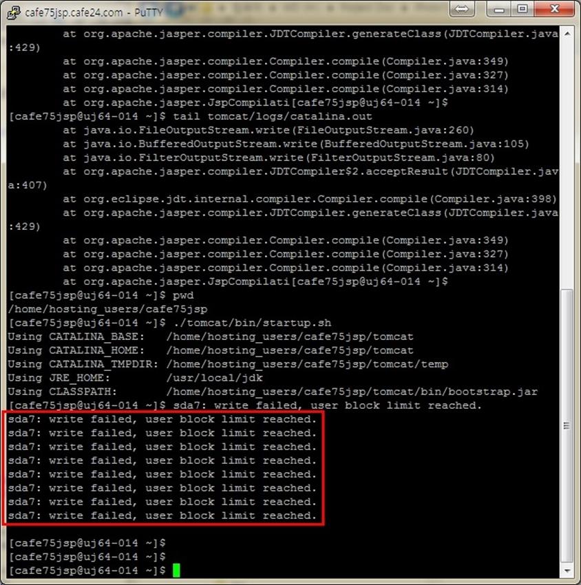 ํฐ์บฃ์ ๋ก๊ทธ๋ฅผ ์ดํด๋ณด๋ฉด ์์ ๊ฐ์ด ์๋ฌ๊ฐ ๋ ์๋๋ฐ, ํ ๋น๋ ๋์คํฌ ๊ณต๊ฐ์ ๋ค ์ฌ์ฉํ๋ค๋ ๋ป์ด๋ค.