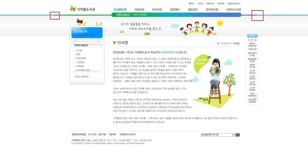 ๊ธฐ์กด์ ์กํ๊ตฌ๋ฆฝ๋์๊ด๋ค์ BG๊ฐ repeat-x๋ก ๋ฐ๋ณต๋๊ธฐ ๋๋ฌธ์, ๋ณ ์ ๊ฒฝ์ ์ฐ์ง ์์์ง๋ง, ์ข์ฐ๋ก ๊ทธ๋ผ๋ฐ์ด์ ๋๋ BG๊ฐ ๊น๋ฆฌ๋ ๋์์ธ์ผ๋ก ๊ฒฐ์ ์ด ๋์๋ค.