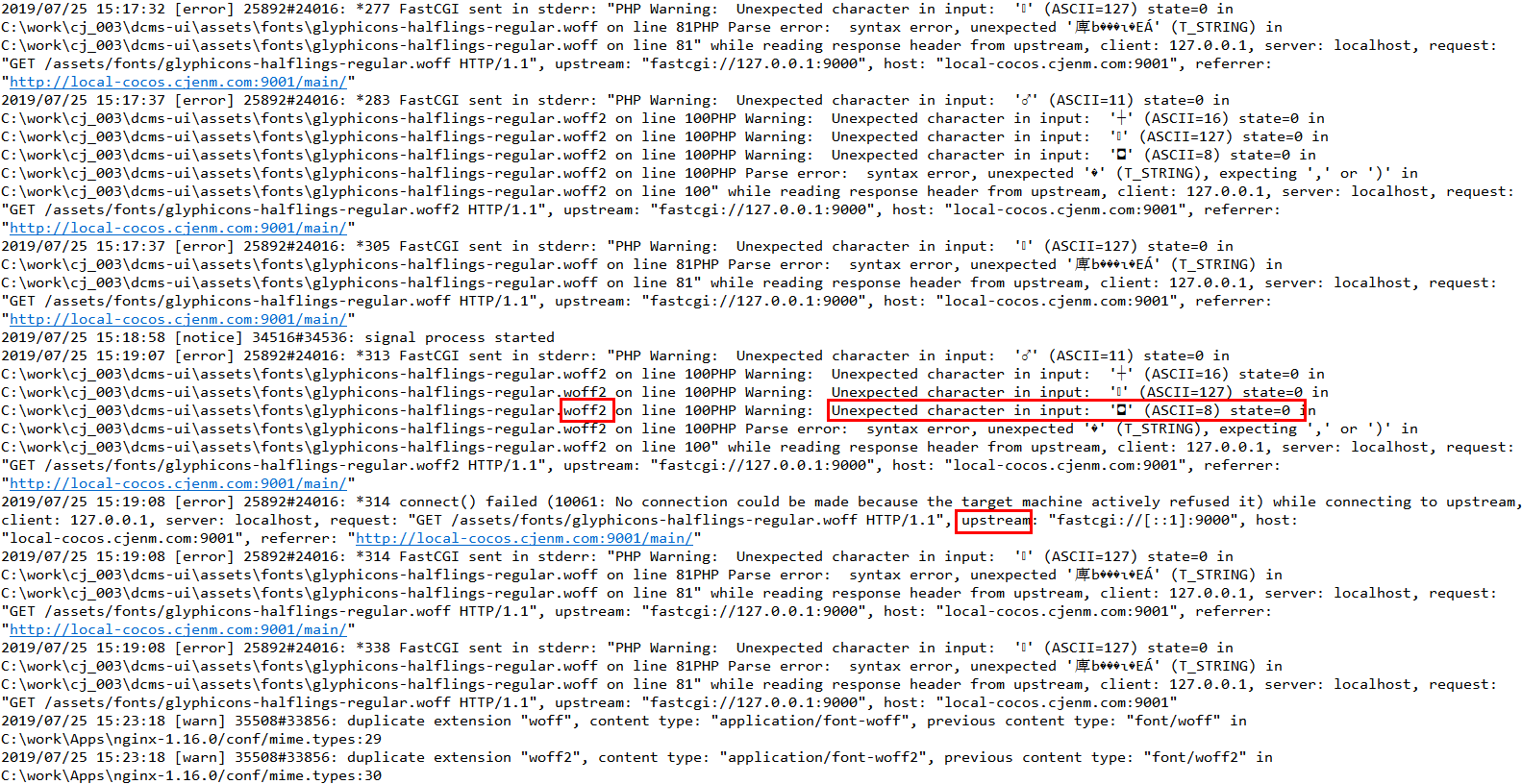 2019/07/25 15:19:07 [error] 25892#24016: *313 FastCGI sent in stderr: "PHP Warning: Unexpected character in input: '' (ASCII=11) state=0 in C:\work\cj_003\dcms-ui\assets\fonts\glyphicons-halflings-regular.woff2 on line 100